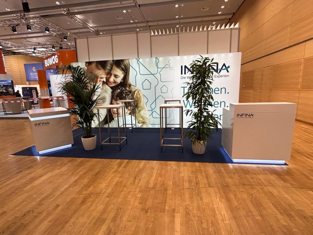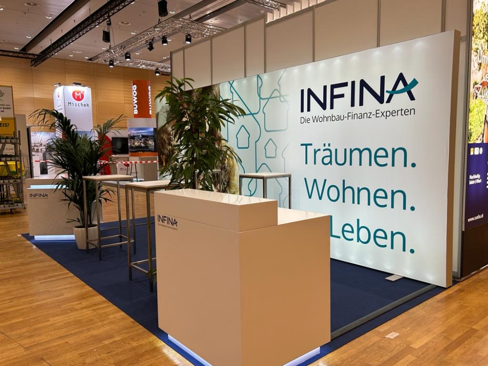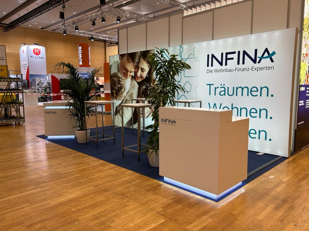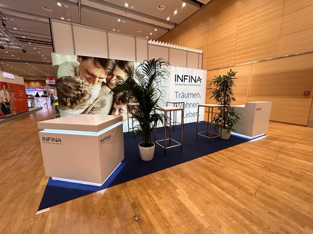 Infina Messestand bei der Wiener Immobilien Messe vom 16. bis 17. März 2023. Kunde Infina Fertigstellung 03.2023 Kategorie Eventbereich