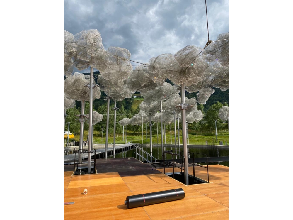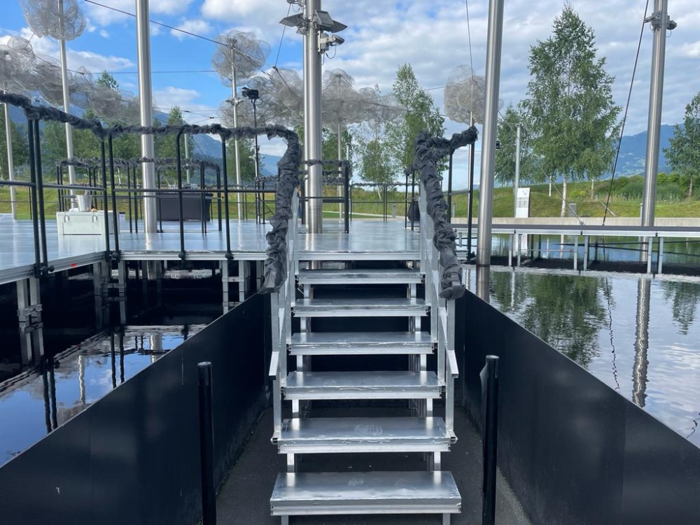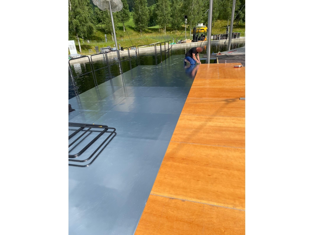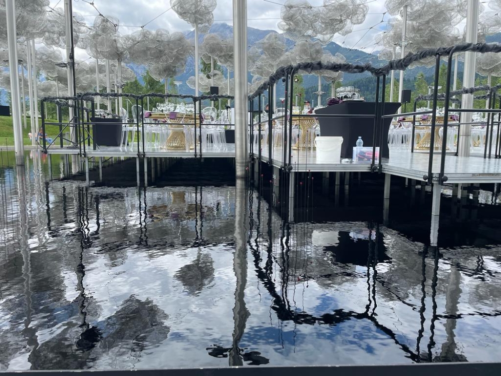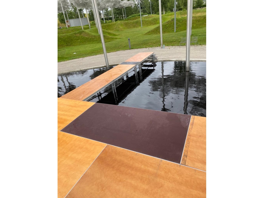 Für ein privates Event wurde eine Plattform inklusive Verkleidung in einem künstlichen Teich gebaut. Kunde Privat Fertigstellung 06.2023 Kategorie Eventbereich