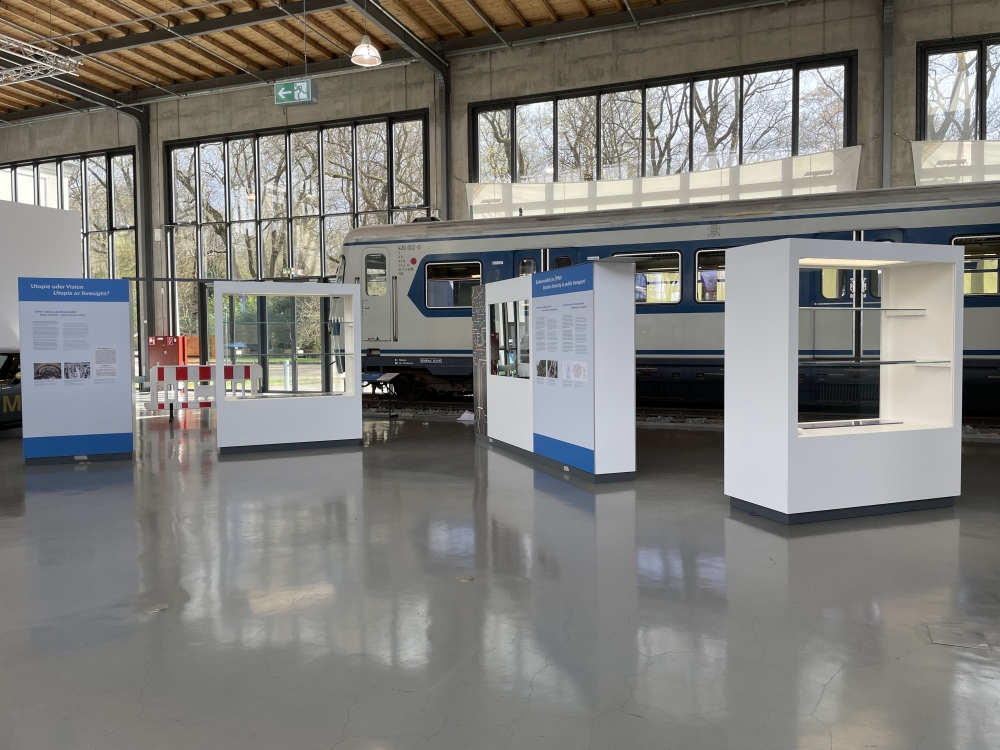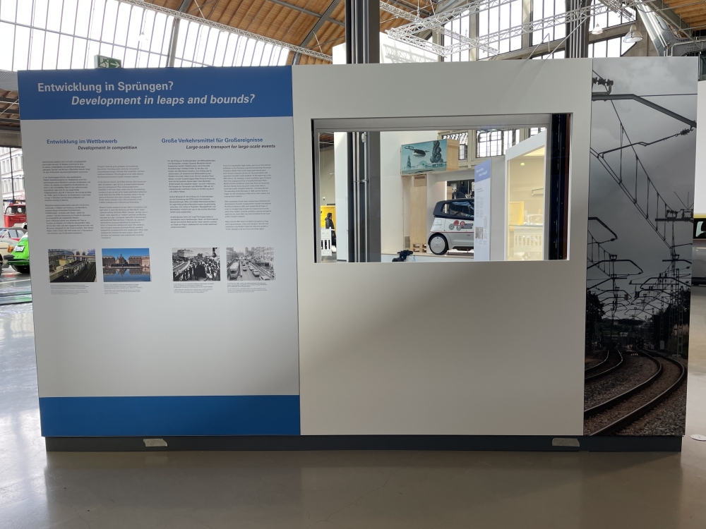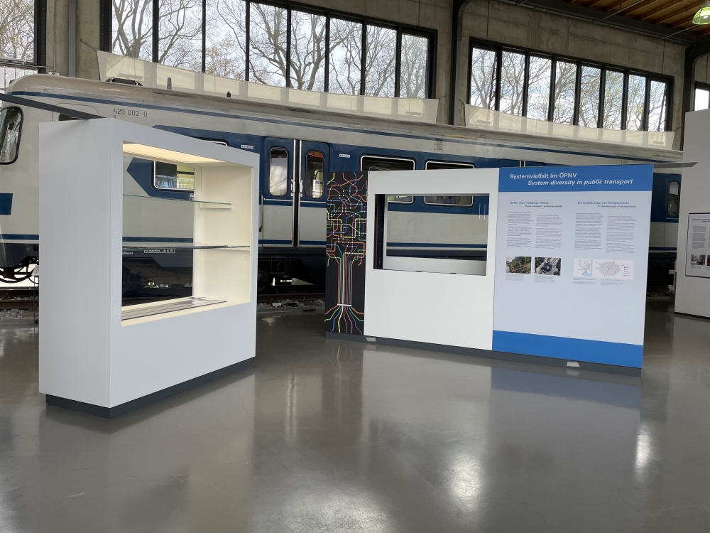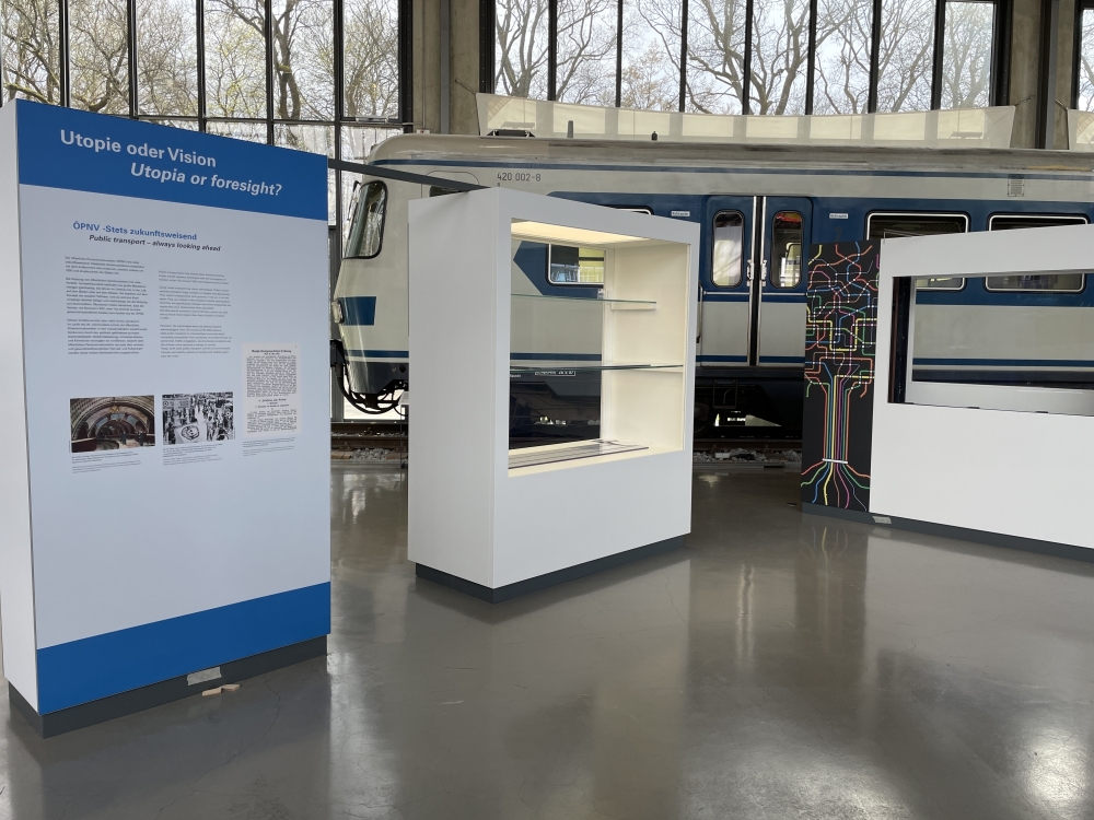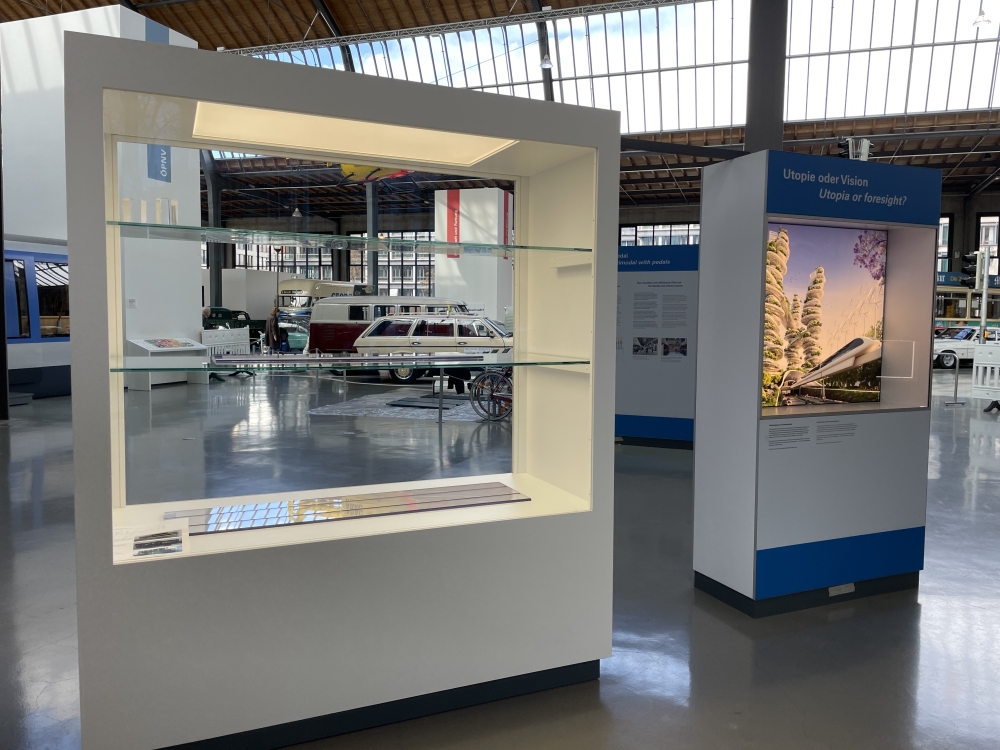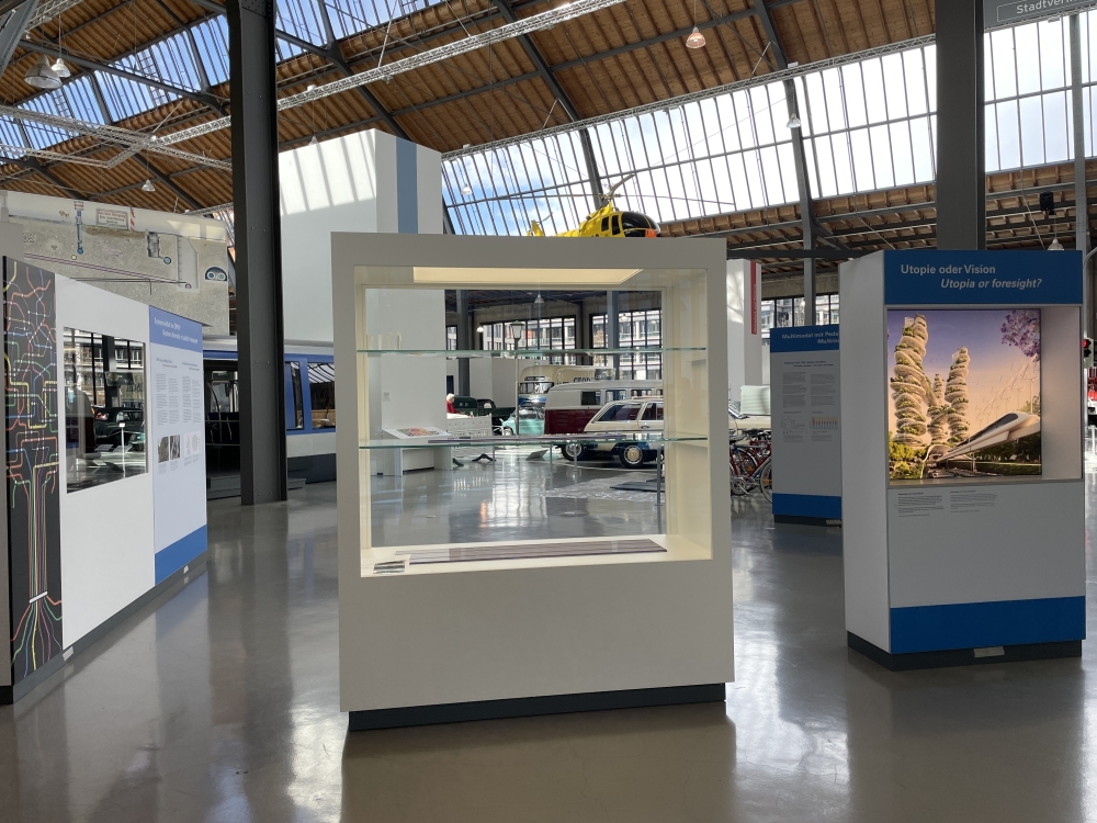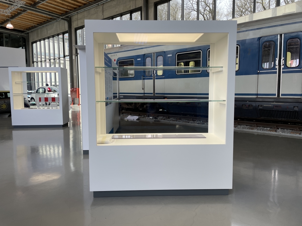 Für das Verkehrszentrum München haben wir die Stufe 2 der neuen Ausstellung produziert und aufgebaut. Unter anderem wurden freistehende und integrierte Vitrinen sowie Wandkonstruktionen mit Kederrahmen konzipiert.