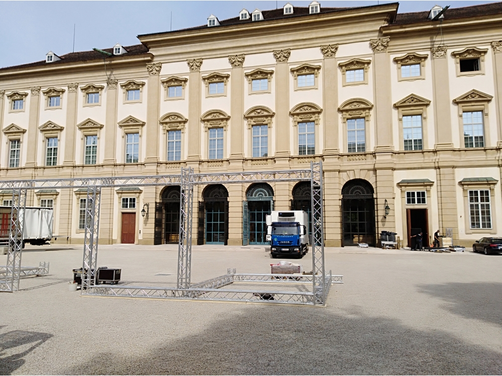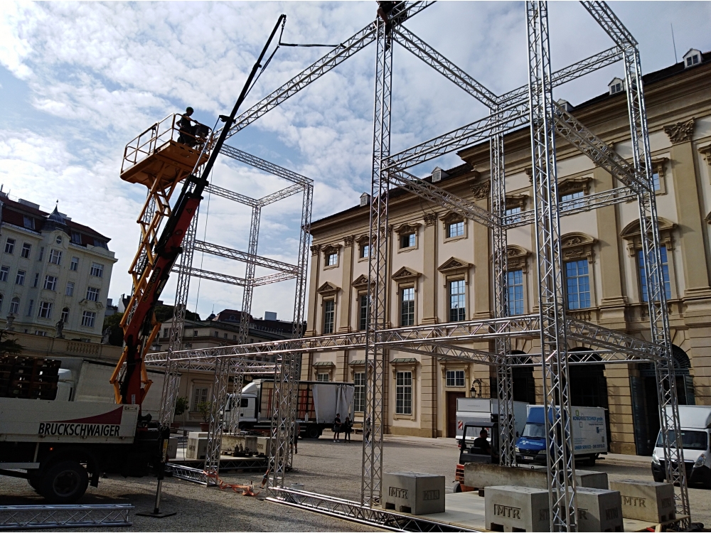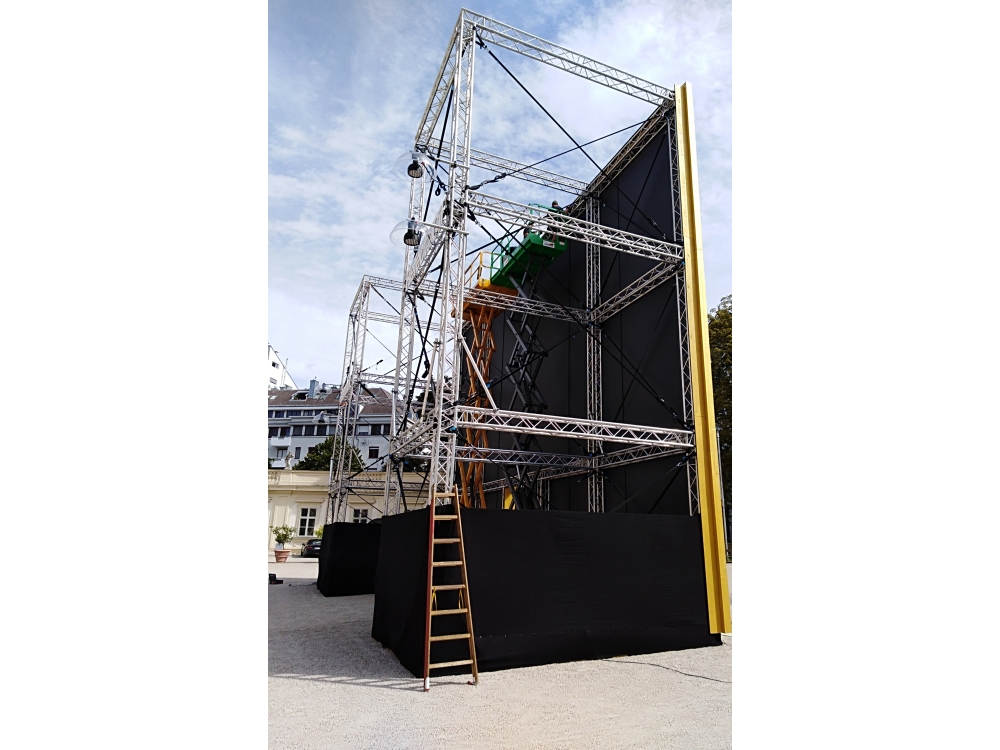 Die Aufgabe unserer Firma war der Auf- und Abbau des 16 Meter breiten, 11 Meter hohen und ca. 16 Tonnen schweren Kunstwerks.