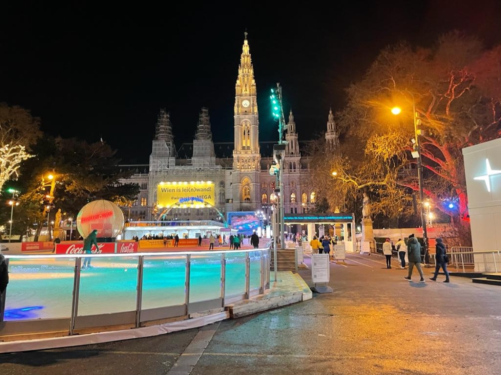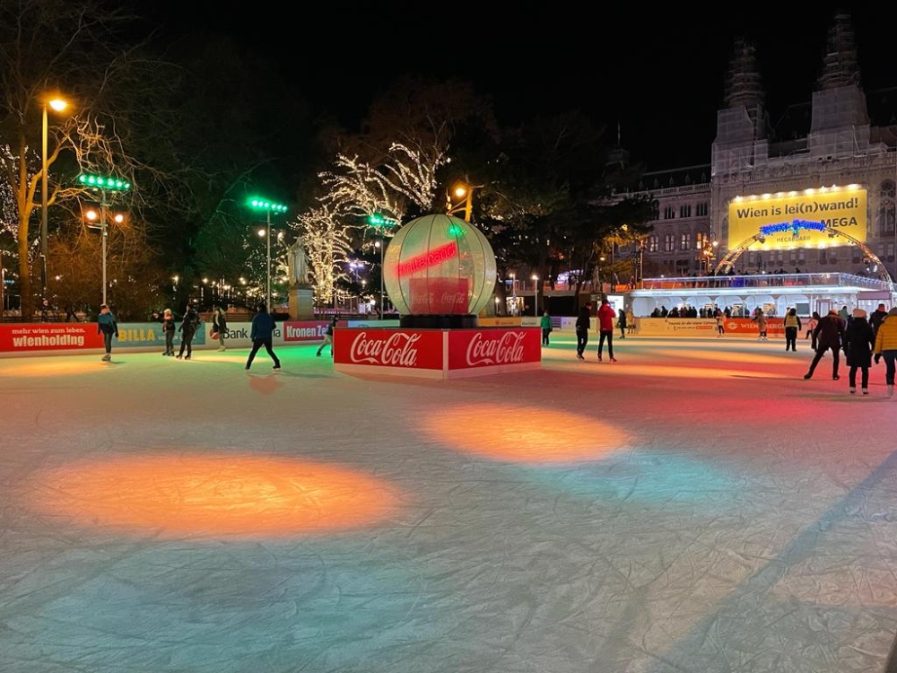 Aufbau der Coca-Cola Schneekugel auf der Eisfläche vor dem Rathaus Links See the video Kunde Stadt Wien Marketing Fertigstellung 01.2022 Kategorie Sonderanfertigungen