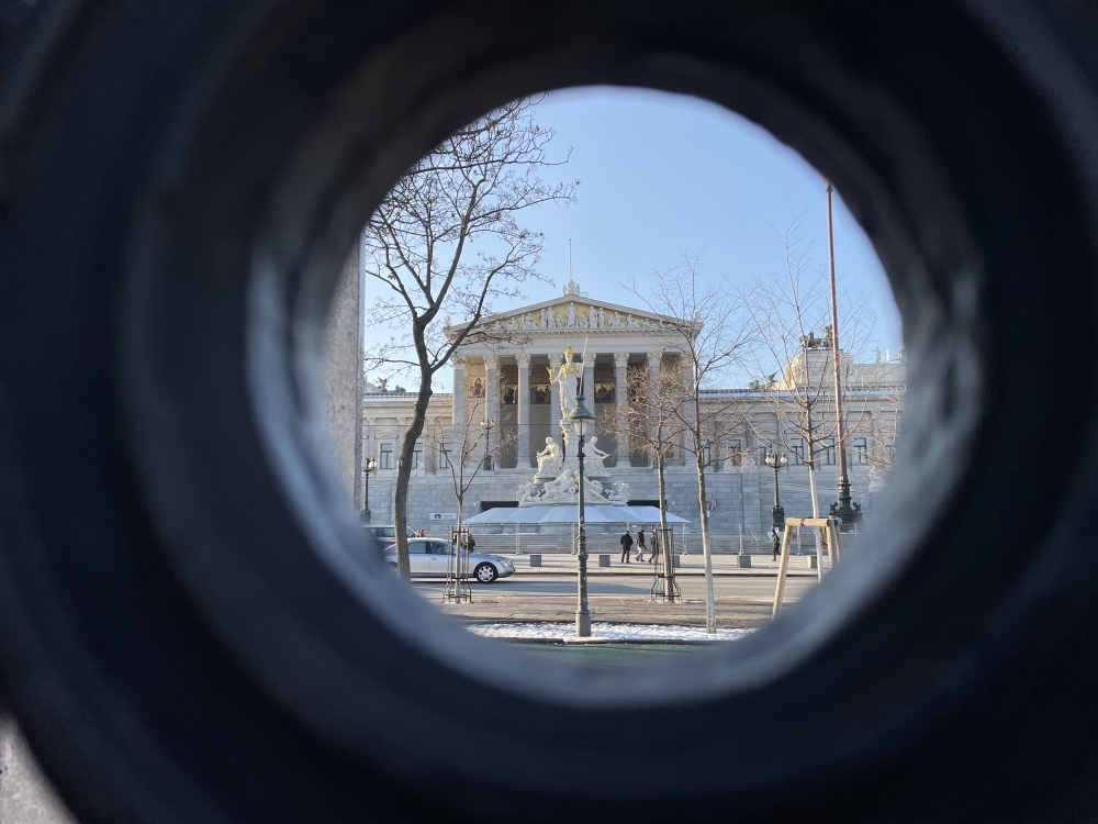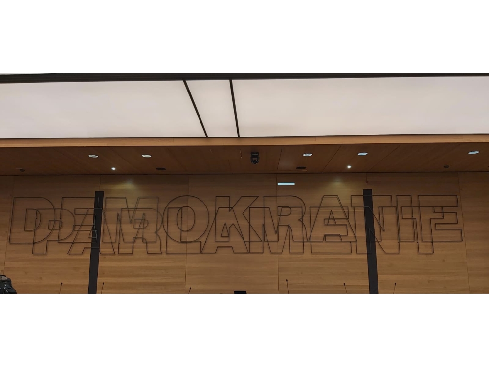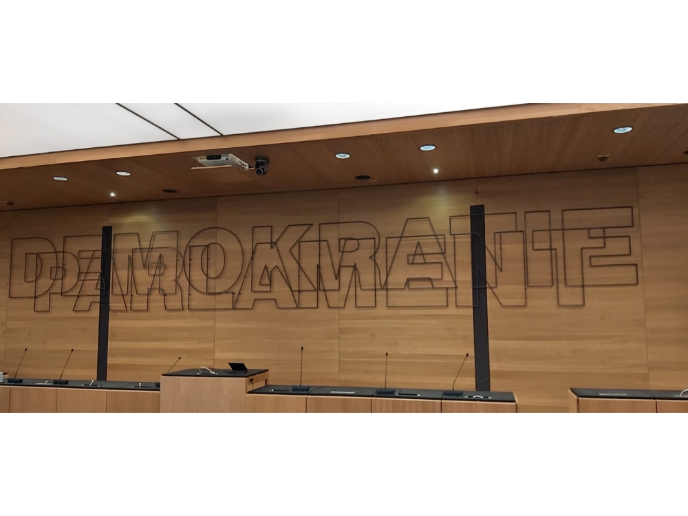 Im fertig renovierten und neueröffneten Wiener Parlament schmücken unsere "Demokratie" und "Parlament" Schriftzüge den neuen Raum für Untersuchungsausschüsse.